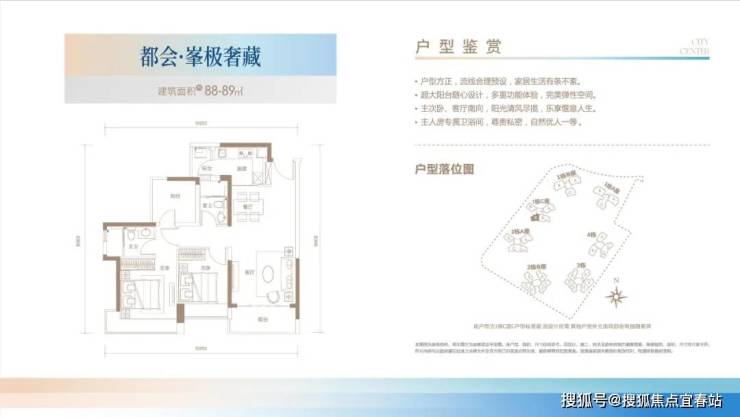 89㎡的3房2厅2卫(B户型),设计的是竖厅南北通透格局,三开间朝南,L型厨房带1个小生活阳台,卫生间干湿分离设计,阳台主朝西南向。