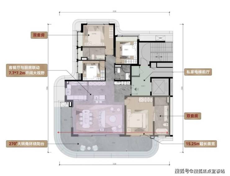 采用270°大转角环绕阳台和进深阳台的组合手法,营造最佳观景体验;超高窗墙比最大化利用三亚顶级气候资源,打造舒适旅居。