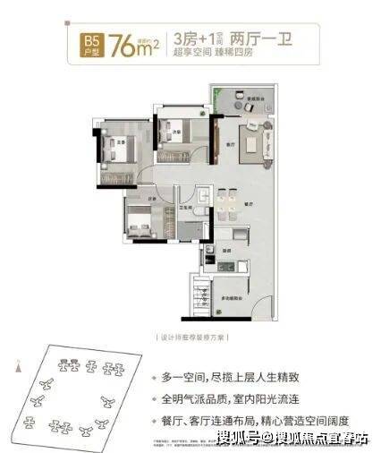 76㎡:3房+1空间2厅1卫