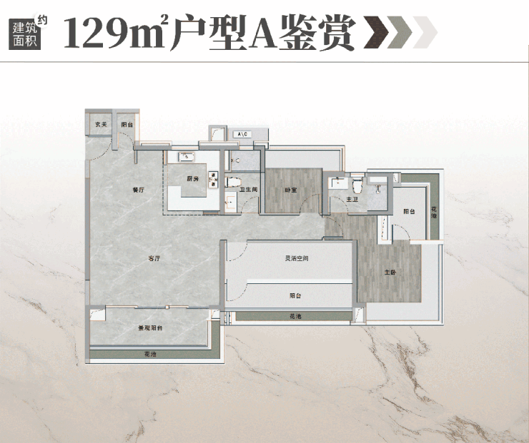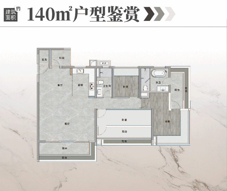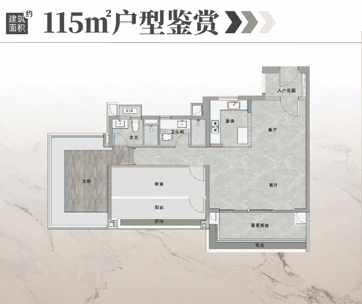 115㎡四房:四开间朝南,约5.8米的宽景阳台加上花池赠送可做两房,全屋南向采光面达21米。