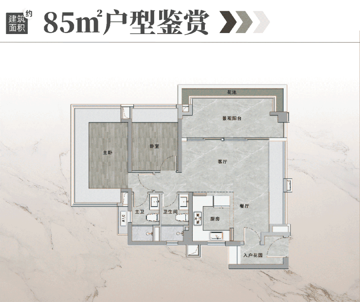 85㎡三房:带入户花园,户型方正通透,南向超大面宽,赠送面积最多,使用率最高。