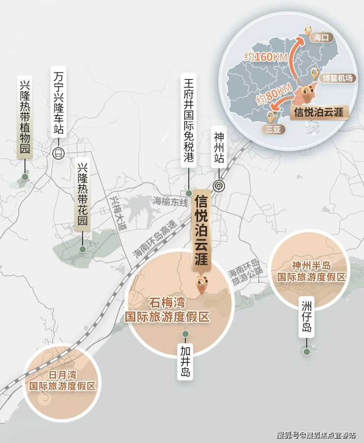 毗邻高铁神州站、万宁站,畅享便捷生活圈,速通博鳌机场、三亚凤凰机场、海口美兰机场;接驳环岛高速、环岛旅游公路,多维出行体验,繁华自然随心所享。