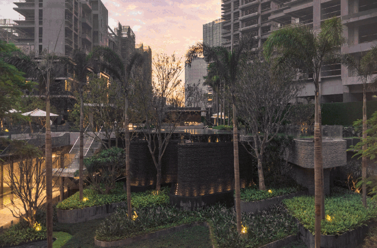 步入项目的安缦系度假园林,搭配不同层次的臻稀植株、进口奢石,聆听叠水溪流,立体造型错落有致,营造别样的归家即度假居住体验。