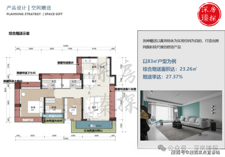 83㎡的3房2厅2卫,设计的是竖厅格局,客厅3.5米开间,LDKB一体化,S墙设计预留冰箱卡槽位,客厅赠送超宽飘窗面,3个卧室分别做到了主卧16.9㎡/次卧6.96㎡/次卧6.67㎡(包含墙体飘窗),客厅连接次卧出5.4米长的大阳台,U型厨房,卫生间干湿分离,得房率约102.6%(包含赠送),西南朝向。