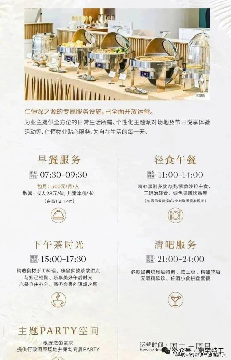 ◎优雅逸境行政酒廊,以“开放式设计+订制化服务”的运营理念,构建“圈层社交+个人私享”的全新体验,提供自助早餐(500元/月)、轻食午餐预定服务,供业主及来宾悠享,全天候多为社交场景+户外露台,可预约包场定制主题派对等专属生活场