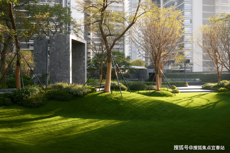 约2万㎡的中央园林犹如一方「微气候绿洲」,通过模拟自然地貌,并高密度栽植近300棵大型乔木,形成了有效的生态调节层;严格选用蜜源与食源植物,吸引鸟语虫鸣,让生态自然循环,从会随触碰运动的粘叶豆,到寓意相思的海红豆,再到秋日绚烂如画的乌桕,园区本身便是一座充满探索趣味的自然博物馆,让生活的每一天都与生机共处。