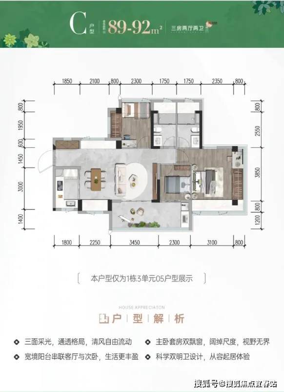 招商雍境名邸位于宝安沙井大前海会展湾片区的招商会展湾雍境名邸,本次是招商会展湾雍境二期,首推1栋3单元的195套房源,面积段有80㎡3房1卫,91㎡3房2卫,92㎡3房2卫3种户型,是3梯7户的普通高层,预计2027年9月精装交楼。