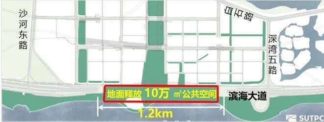 滨海大道(总部基地段)交通综合改造工程西起沙河东路,东至广深高速滨海立交。改造路段全长约6公里,全线按主路双8+辅路双6进行改造,其中下沉隧道长约1.2公里,下沉隧道与高强度开发地区交通组织衔接形式采取多点进出,主、辅路均原位下沉,主线平铺浅埋,辅路竖向分层