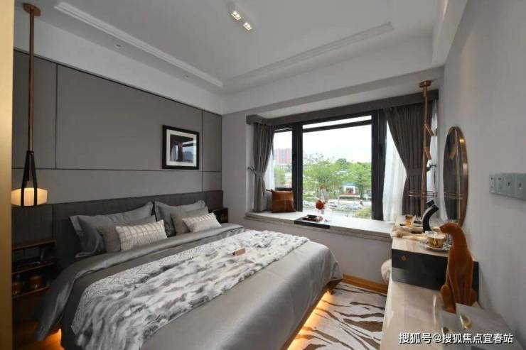 主卧空间也很奢阔,并带全景飘窗,躺在床上就能欣赏巨幕城市大片,令人羡慕。