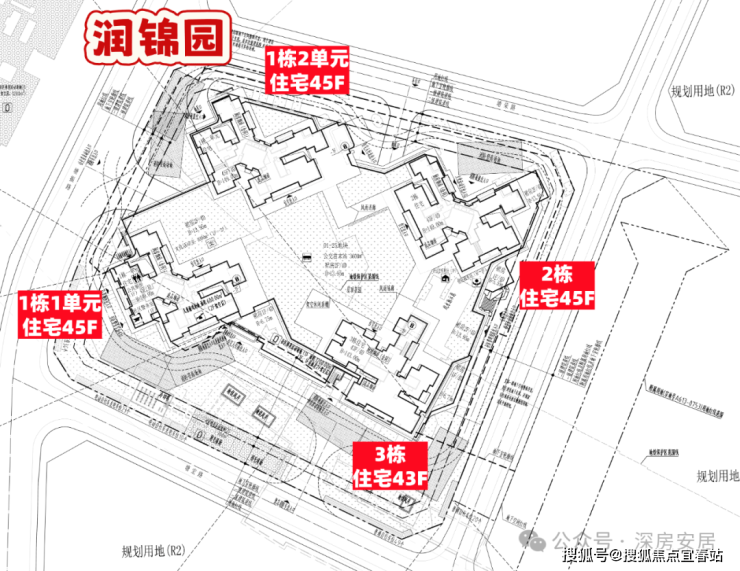 即将入市的润锦园:总占地面积约1.58万㎡,总建筑面积约15.87万㎡,计容建筑面积约11.16万㎡,容积率7.06,绿化率40.01%,共由4栋总高43-45层高的住宅组成,其中1栋1/2单元/2住宅45层,3栋住宅44F。