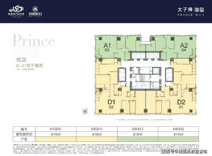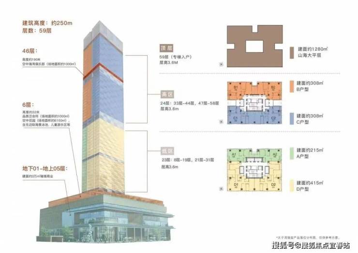【太子湾•瑞玺】总高250米,共1栋,是太子湾片区的天际线坐标,分为高低两个区域,低区8-31层,面积为215-415㎡;高区33-58层,面积为308㎡。