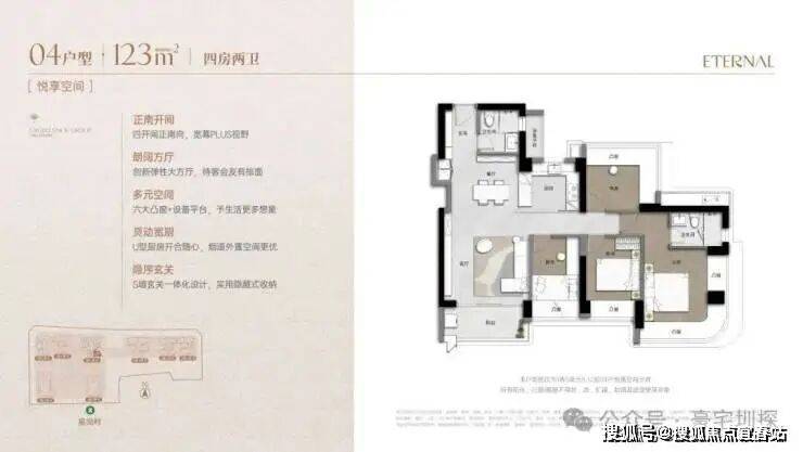 123m²的4房2厅2卫,竖厅格局,客厅4.2米开间,LDKB一体化弹性大方厅,S墙设计预留冰箱卡槽位,四开间朝南,动静分区,主卧套房270°环幕凸窗,六大凸窗+设备平台,U型厨房,卫生间干湿分离。阳台正南朝向看皇岗公园,得房率76%(不含赠送,套内面积93.94㎡)。