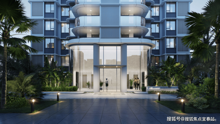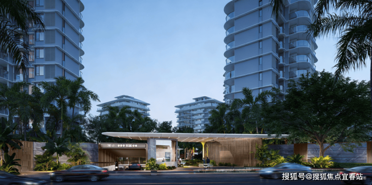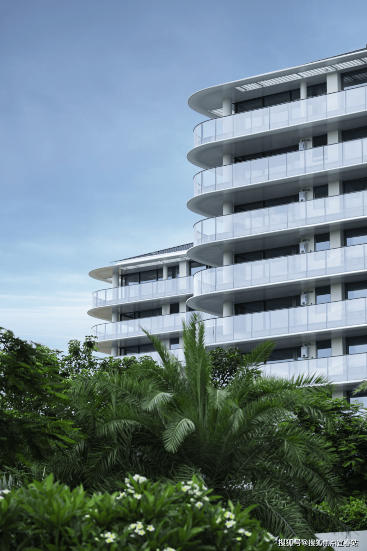 1.以三亚海岸为灵感,区别于常见的同质化/复制化设计,采用类公建化建筑形式区别于传统立面造型,以白色与灰色为主色系,通过铝板与玻璃所呈现的横向柔美线条,铝板层间线条采用创新弧形,紧扣“云端”与“海洋”母题,让建筑呈现出“云上花园之居,水上漂浮之所"的海洋灵动感。