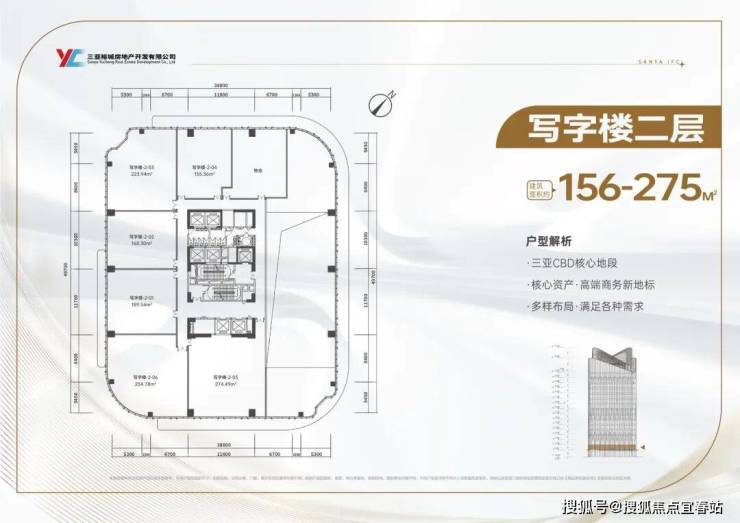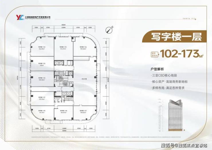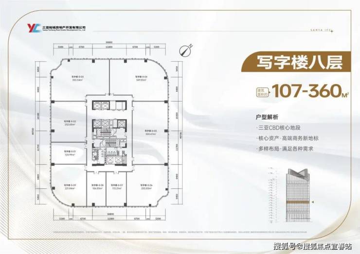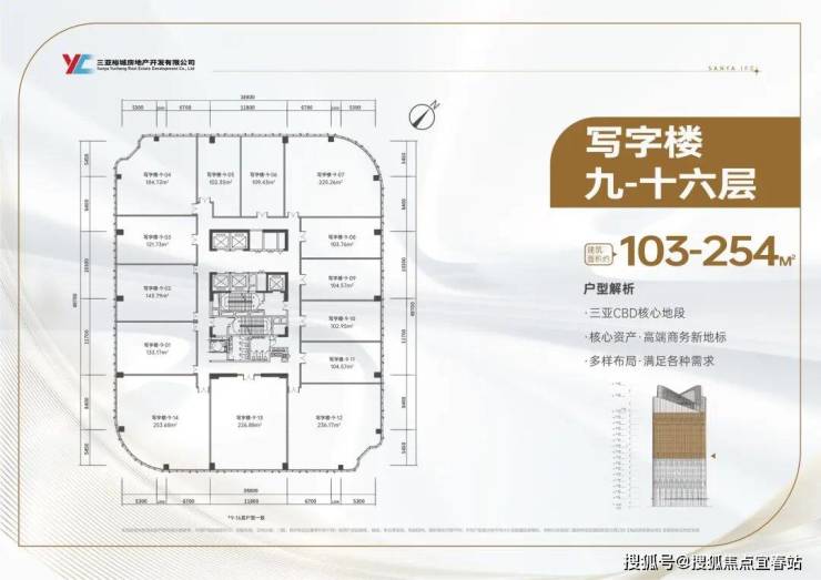 ——产品介绍——• 三亚CBD核心地段,核心资产,高端商务新地标。• C地块主楼办公 总建筑面积:32655.63㎡(共计16层,可售1层9套,2层6套、8层4套,9-16层112套,共计131套)• 一楼商业得房率98%。
