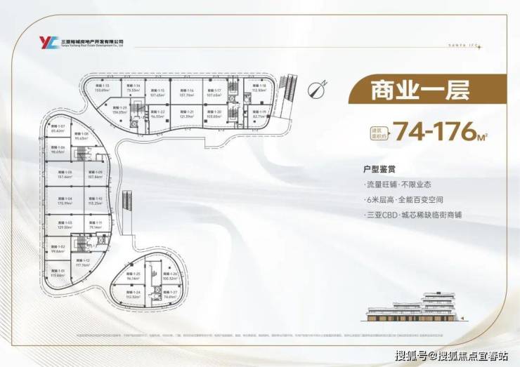 1F 挑高6米 建筑面积:74-176㎡ (27套)三亚CBD 城芯稀缺临街商铺