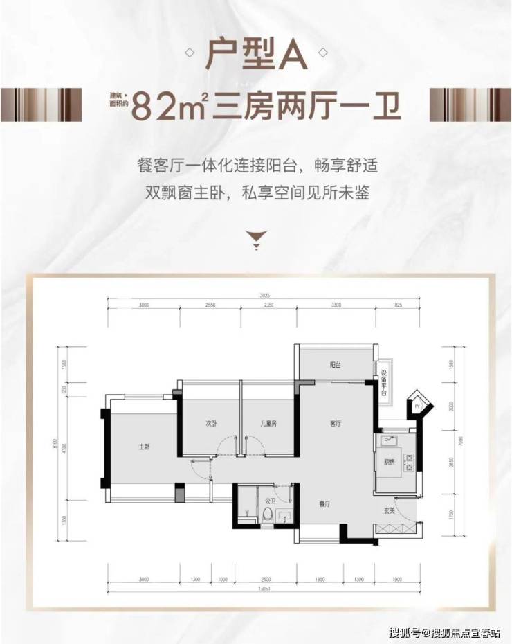 局,进门入户玄关,客厅3.3米开间,LDKB一体化设计,3个卧室分别做到了3米/2.55米/2.35米的宽度,主卧双飘窗南北通设计,U型厨房,得房率:77.51%(不含赠送),阳台主朝东北向。