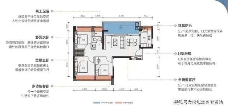 户型方正、实用率高,赠送面积多