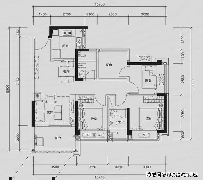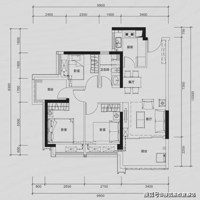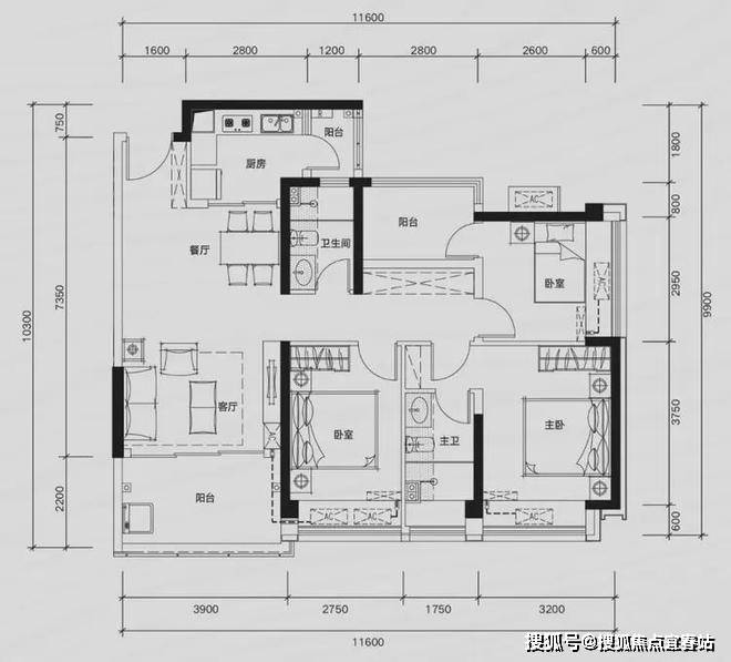 G02户型:约109㎡ 四房两厅两卫: