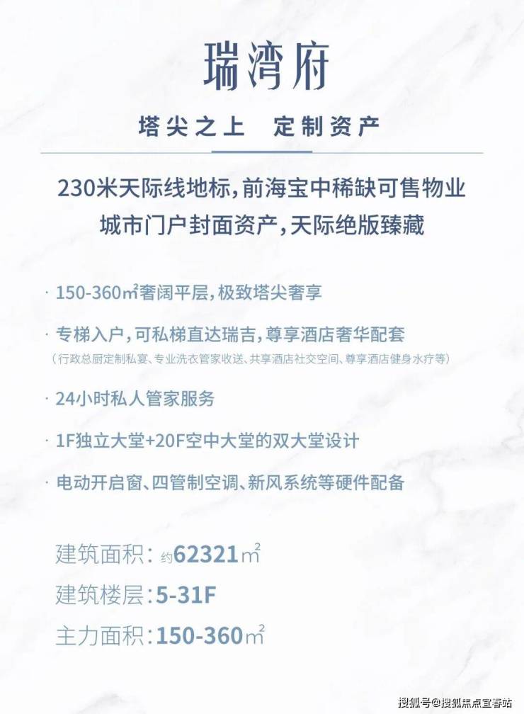华侨城瑞湾府位于深圳宝安中心区,是集瑞吉酒店、企业会馆、超甲级办公和精品商业于一体的超高层城市综合体。项目由知名开发商华侨城打造,主推建面约190-360㎡大平层。周边交通便利,配套齐全,包括地铁、学校、医院及文化休闲设施,是深圳湾区的商务新地标。