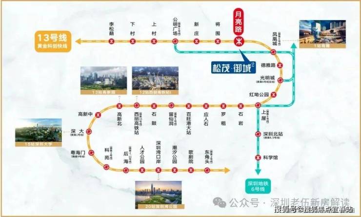 松茂御城交通优势显著,距离在建的13号线月亮路站仅约400-600米,预计2025年底-2026年通车后,1站可达光明中心区,直达南山科技园,3站到光明城站,5站到石岩上屋站。