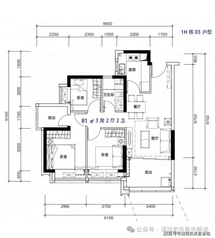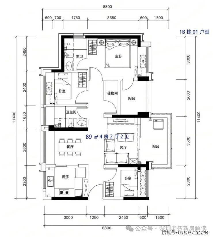 以89平南北通透户型为例,户型开间分别为2.3米、2.6米、3米,保证基本尺度的同时还做了细微的差异,同时客卫开局1.65米,主卫1.75米,也有细微的差异以及面积的控制,小面积户型其实跟考究设计功底,这里差0.5那里差1平米,面积自然就省出来了。
