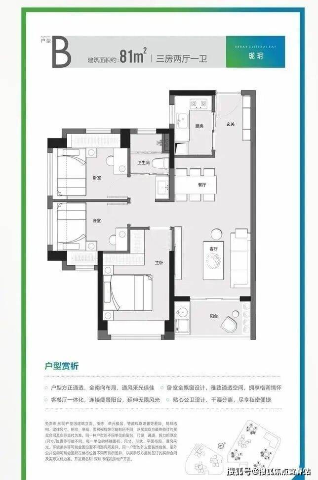 约81㎡三房一卫(1栋2单元05/06户型、3栋1单元03/04户型、3栋2单元02/05/06户型、5栋01/03/04户型)竖厅格局,餐客一体,动静分区结构,卫生间干湿分离设计,有东南朝向和西南朝向。