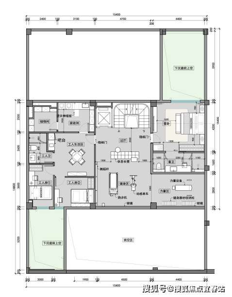 负一层下沉庭院周边环绕健身区、工人生活区与丰富储物空间;