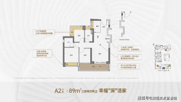 客厅3.5米开间,LDK一体化,客厅连接次卧出5.9米双开间大阳台,次卧270°转角飘窗。