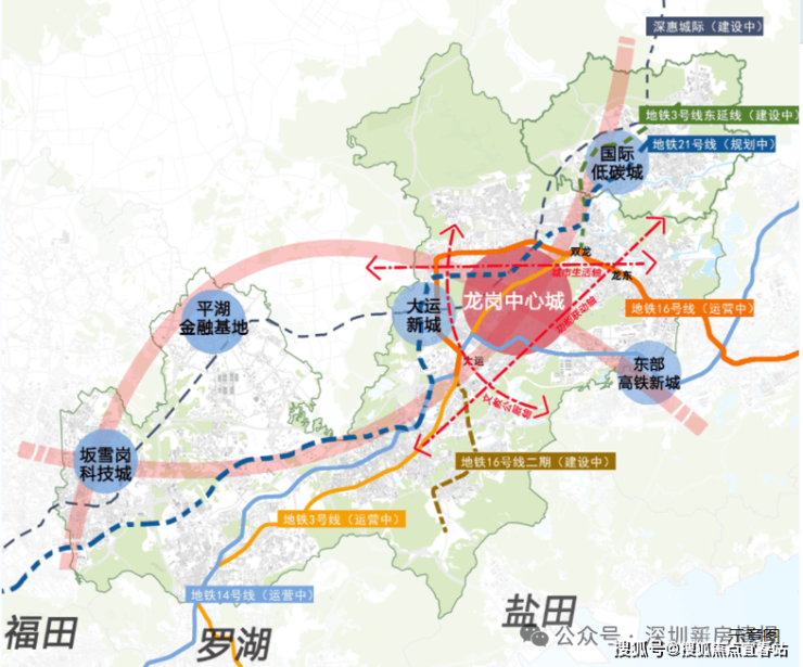 在龙岗发展一路向东的大趋势下,依托地铁3/16/14号线的轨道交通效能,“东部副中心”强势崛起,地铁16号线东轴方向成龙岗中心城外拓首站,“一芯两核多支点”战略赋能、超百万方城市更新推进,多重势能叠加,区域未来可期①。