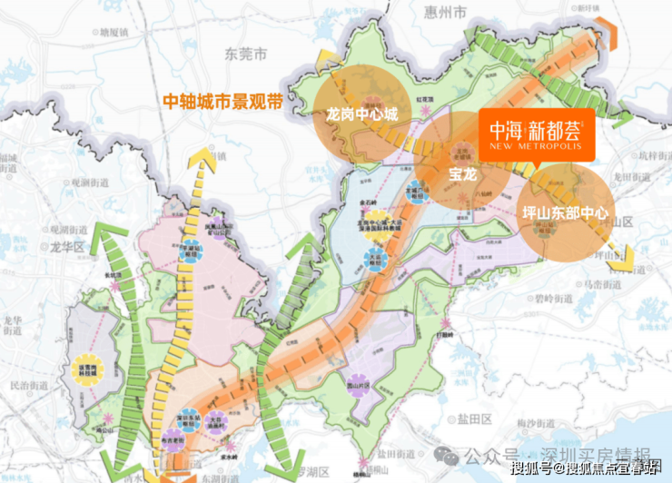在深圳“十四五”规划中,将龙岗区未来的发展定位为深圳城市东部中心,“一轴两带三通廊”②规划建设,规划龙中核心区由双龙沿16号线横轴发展,开启龙岗新地铁横轴线发展新动力,推动龙中居住核心板块外拓发展。本项目处于“龙岗中心城-宝龙-坪山东部中心中轴城市景观带”,重启龙岗高品质居住时代,即享城市发展利好。