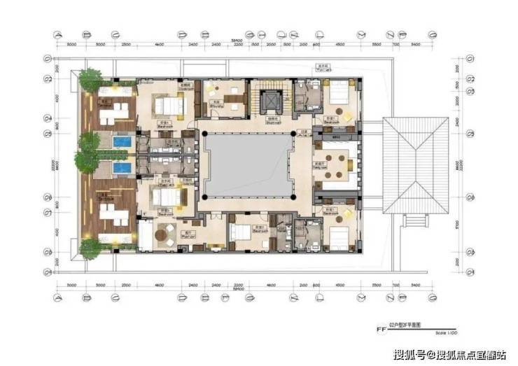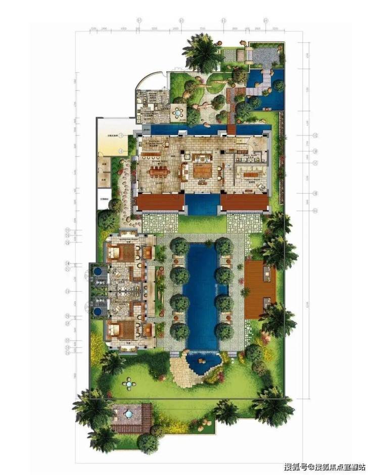 庭院西部双卧室对称而立,配套卫生间与室外淋浴间,尽赏超大泳池景观,起居室与餐厅、家庭室浑然一体,共赏中心庭院水木清华,四季芳菲愉悦身心。设保姆间、洗衣间、卫生间与中式厨房,主仆区域分明,大家风范可见一斑。