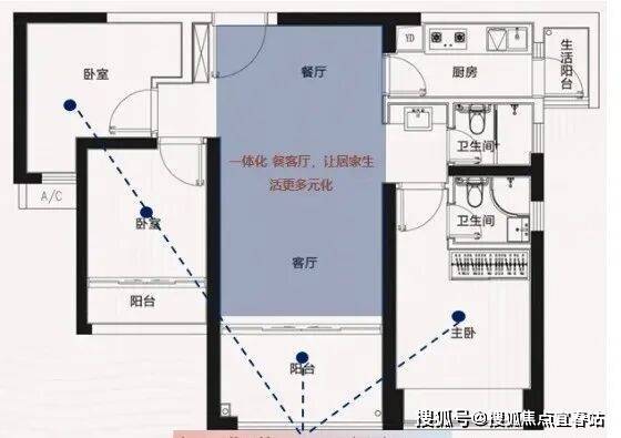 一体化餐客厅:餐客厅+阳台一体化设计,让家人生活空间各有所享