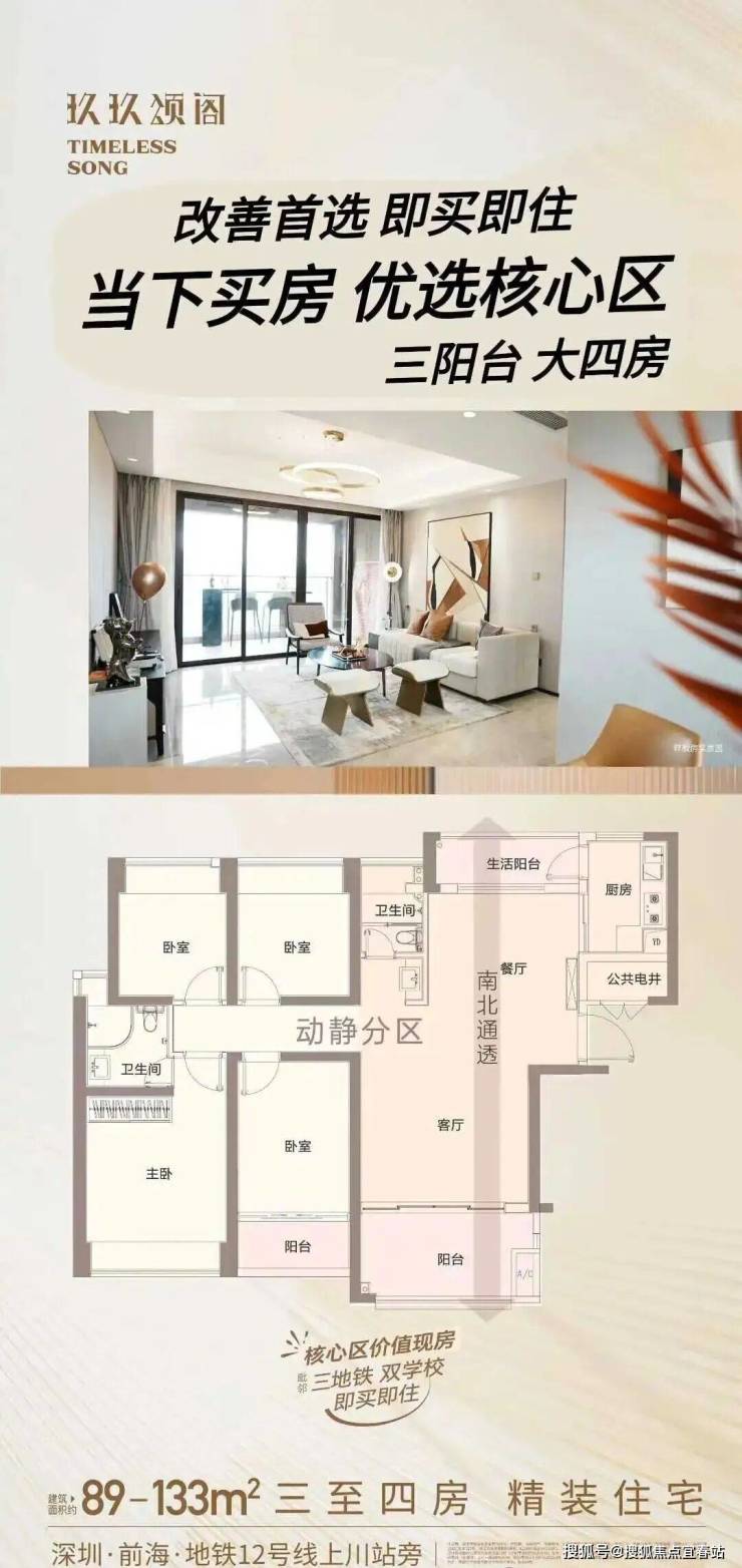 阳台阔绰:前海稀缺在售89㎡三房两卫三阳台,客厅阳台进深1.9米,揽收城园双景