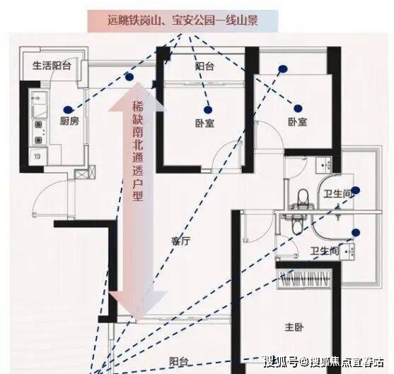 南北通:稀缺端头位,客厅、主卧东南、次卧西北,南北通透,采光、通风无忧