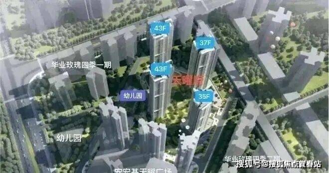 项目地块近似长方形,由4座住宅塔楼和1座幼儿园教学楼组成,其中1栋1-3单元总高35-43层,每层3梯5户;1栋4单元总高37层,每层3梯6户(回迁房都在此座),2栋为3层高的6班幼儿园教学楼。