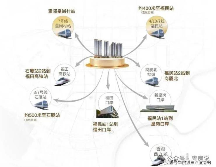 4地铁环绕:从项目步行 300 米到 7 号线皇岗村站,3 站到福田站换乘高铁,4 站到会展中心,15 分钟直达香港。距4/10号线福民站约300米、3号线石厦站约500米。