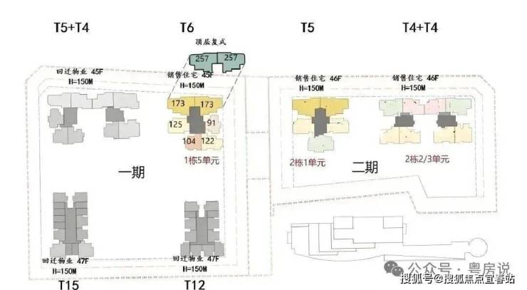 首推一期1栋5单元(45层),91-173㎡3-4房,共232套,以122-175平米4房为主,占比83%,还有两套257平顶复产品。173/257平大户型双电梯独立电梯厅入户,南区91-125平户型3梯4户。