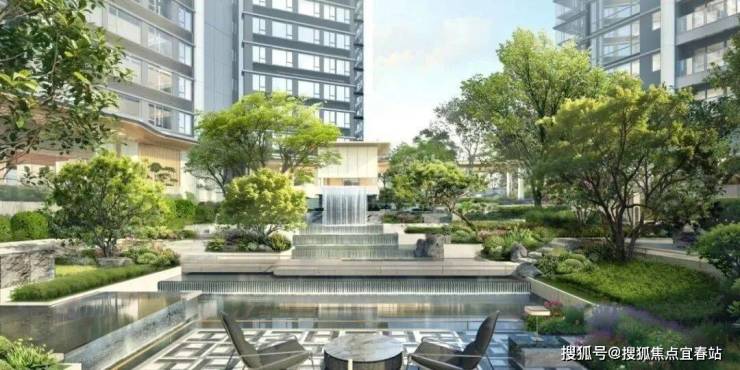 【飞瀑氧吧】:园林中庭巧妙利用高差,跌瀑、叠水、山石、树木等自然元素与中庭水苑、茶室等现代空间相互交织,营造典雅森系水院空间;
