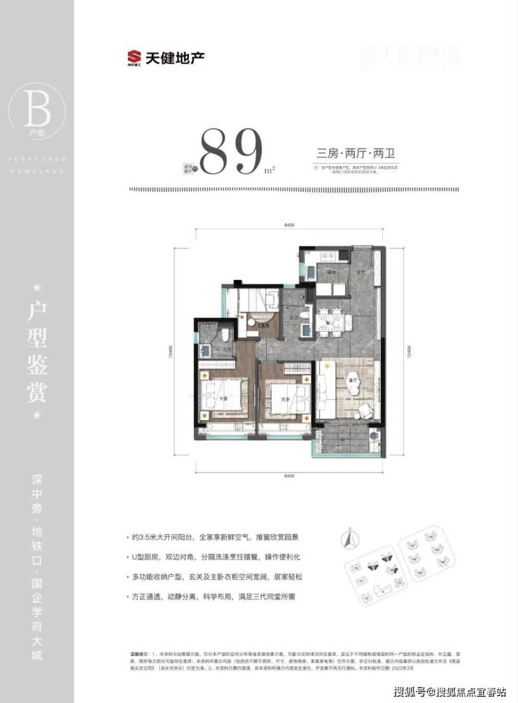 89㎡的3房2厅2卫,设计的是经典竖厅格局,进门入户玄关,客厅3.5米开间,三开间朝南,U型厨房,公卫三段式分离,得房率81.3%(不含赠送),阳台朝西南或东南向。