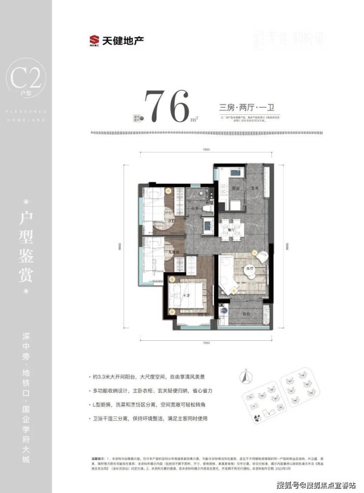 76㎡的3房2厅1卫,设计的是竖厅格局,进门入户玄关,客厅3.3米开间,L型厨房,卫生间三段式分离,得房率75.05%(不含赠送),阳台朝西北、西南或东北向。