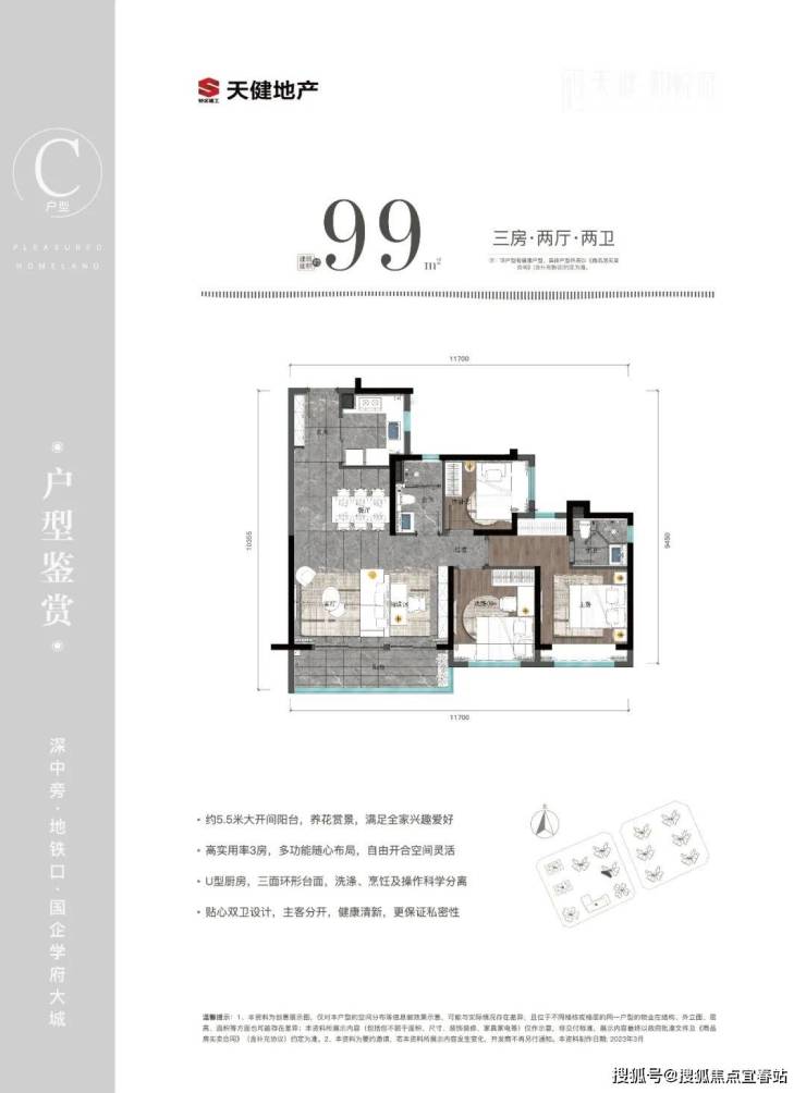 99㎡的3房2厅2卫,设计的是经典竖厅格局,可以改4房,进门入户玄关,客厅5.3米开间,三开间朝南,U型厨房,公卫三段式分离,得房率81.7%(不含赠送),阳台朝西南向。