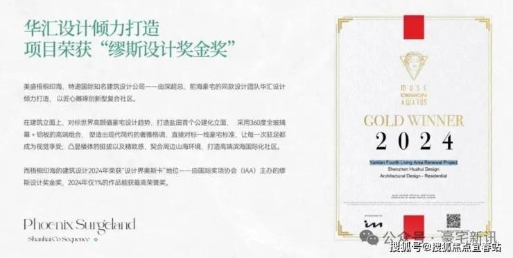 建筑大师:特邀深超总/前海豪宅同款设计团队华汇设计操刀,其作品从全球近3.8万件中脱颖而出,斩获有“设计界奥斯卡”之称的2024年国际奖项协会(IAA)缪斯设计奖金奖,该奖项仅约1%作品可获最高荣誉;