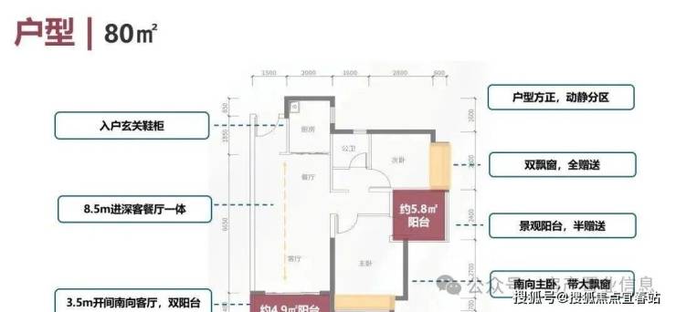 建面约80㎡的户型开间就有约3.5米,格局方正、动静分离、空间开阔、采光充足。基本上达到了市面上90㎡以上户型的尺度。