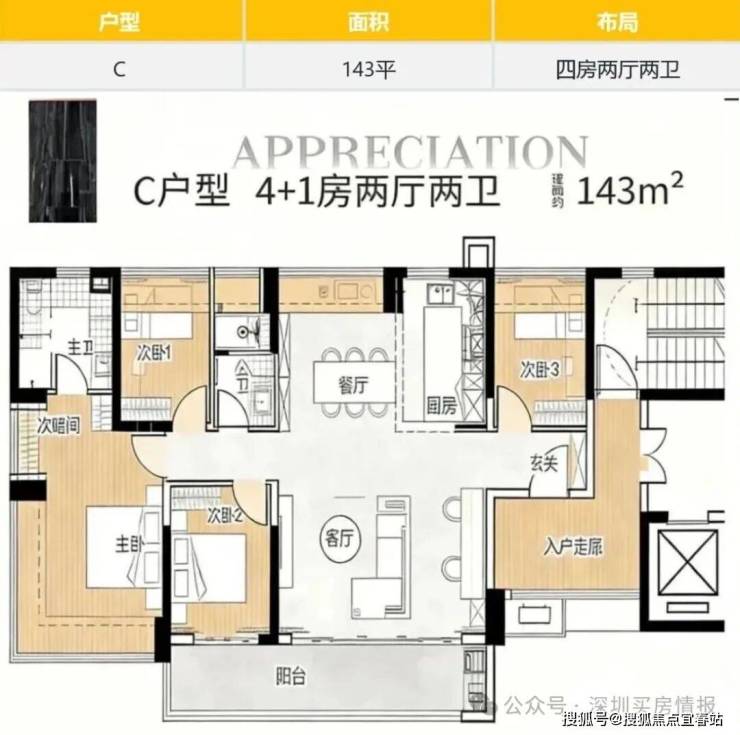 143㎡的4房2厅2卫,设计的是横厅南北通透格局,进门独立入户走廊全赠送,客餐厅分离化设计,横厅大客厅+功能间,五开间朝南,主卧270°无柱转角飘窗+1个次卧朝南,2个次卧朝北向,U型厨房,卫生间干湿分离,得房率约:100%(包含赠送),西南或正南朝向。