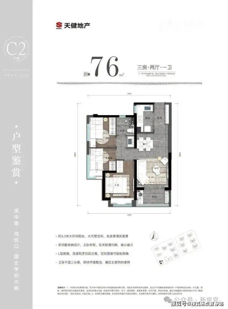 76㎡的3房2厅1卫,设计的是竖厅格局,进门入户玄关,客厅3.3米开间,L型厨房,卫生间三段式分离,得房率75.05%(不含赠送),阳台朝西北、西南或东北向。