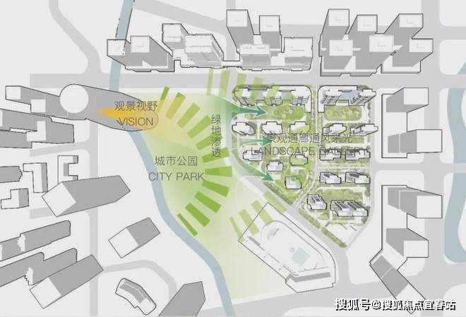 项目因地制宜,把小区西侧的城市公园视野引入社区,打造内院、外园的无界绿色视觉。