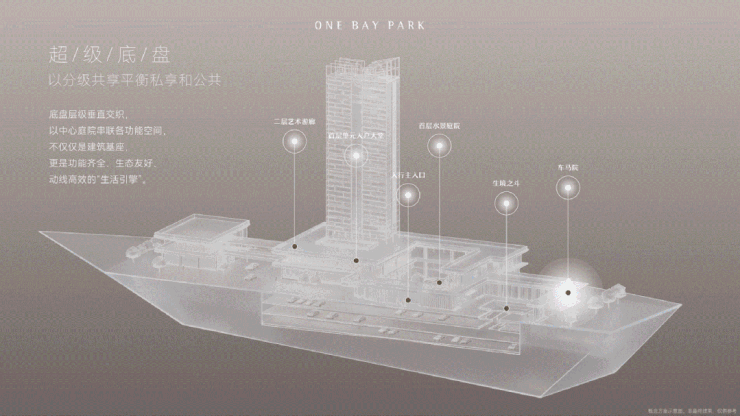 首先,是创新性地做了一个「生境之斗」,将下沉式庭院和地下停车场结合,上接宇宙苍穹,引入阳光、绿植、海风,改变了传统地下车库的封闭、阴暗的空间形象,叠加首层庭院的围合绿洲、车马院、酒店式落客区,茶语轩,将归家动线打造成一场充满仪式感的疗愈静谧之旅,让业主无论是开车归家还是步行归家,一路都是风景,私密且隐逸。