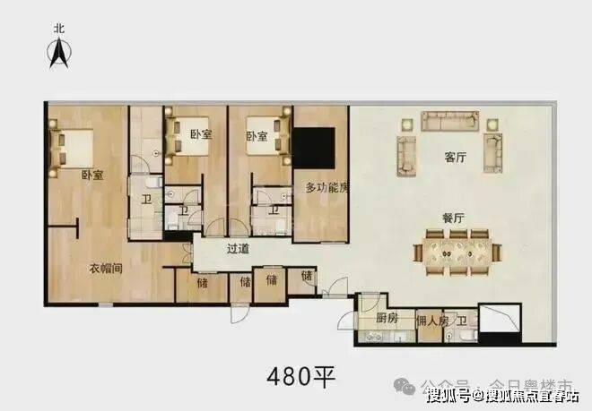 480平3+1房 3+1房(三套房)客厅105平,主卧65平奢阔设计。