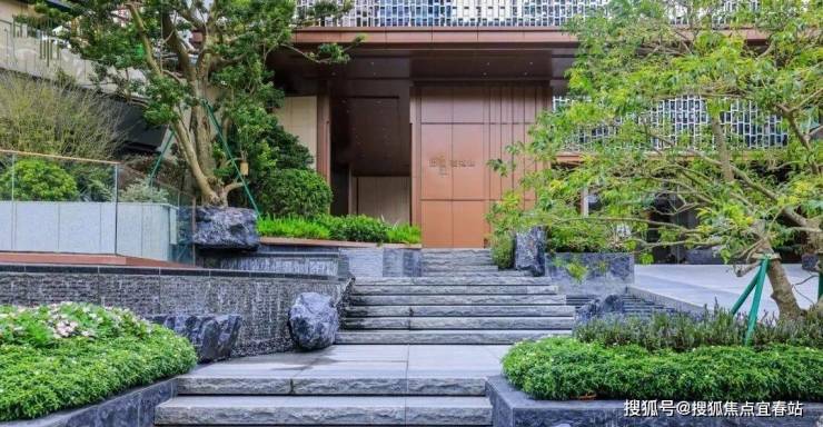 小区是往现代高端社区方向打造,步行大门是山林水石设计,而车行出入口则设计了酒店级回旋处落客区,跟「胤璞」很像。