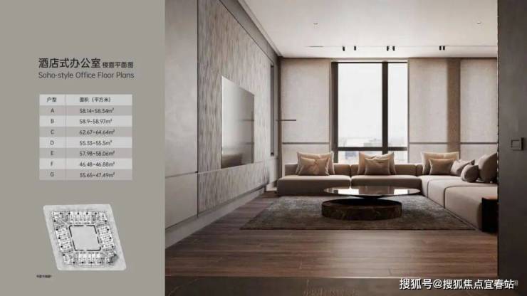 户型:酒店式办公 35-65 ㎡、开放式办公 146- 268 ㎡